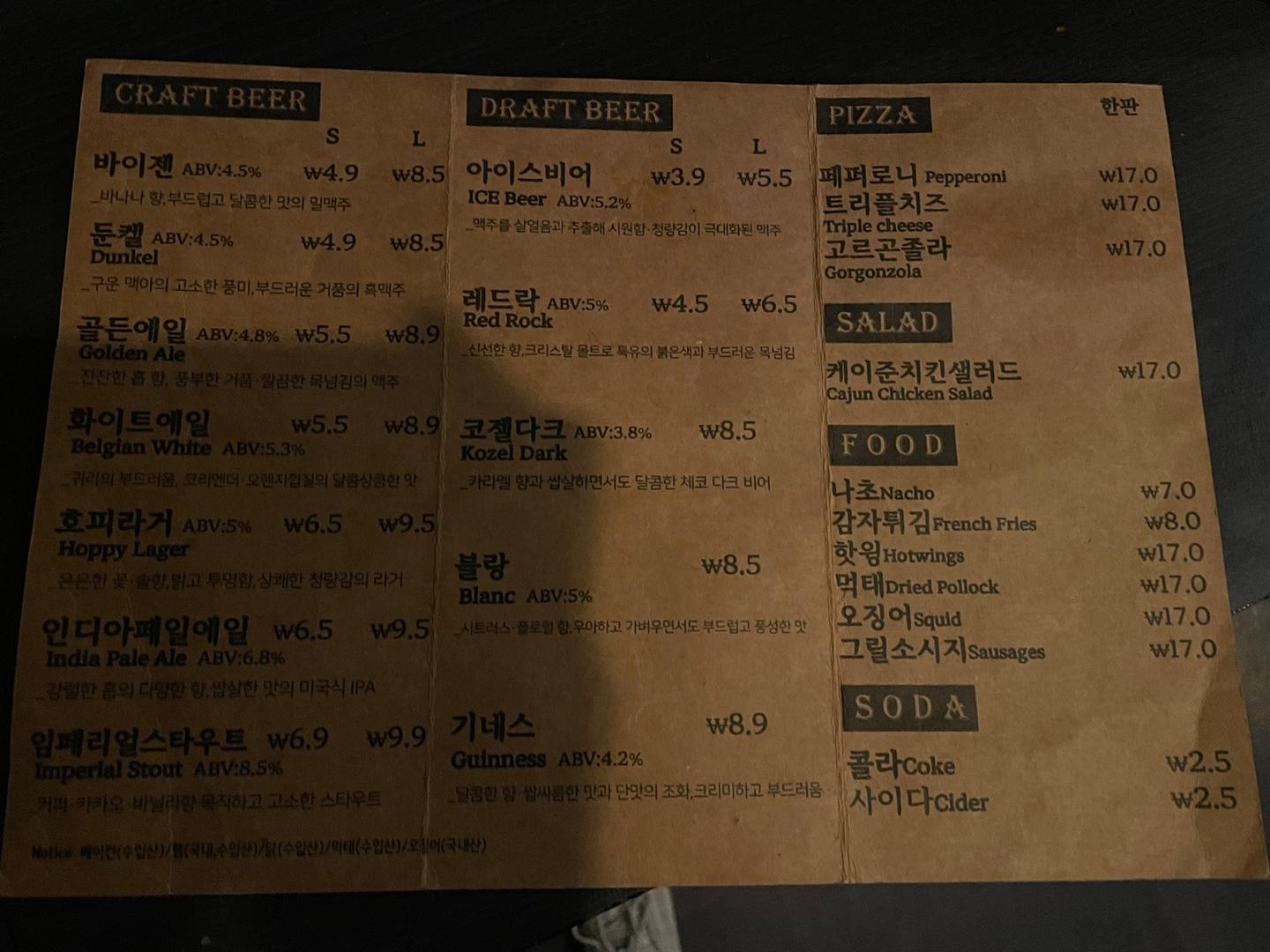 수제맥주집 답게 맥주 종류는 크래프트비어, 드래프트비어로 나눠져요