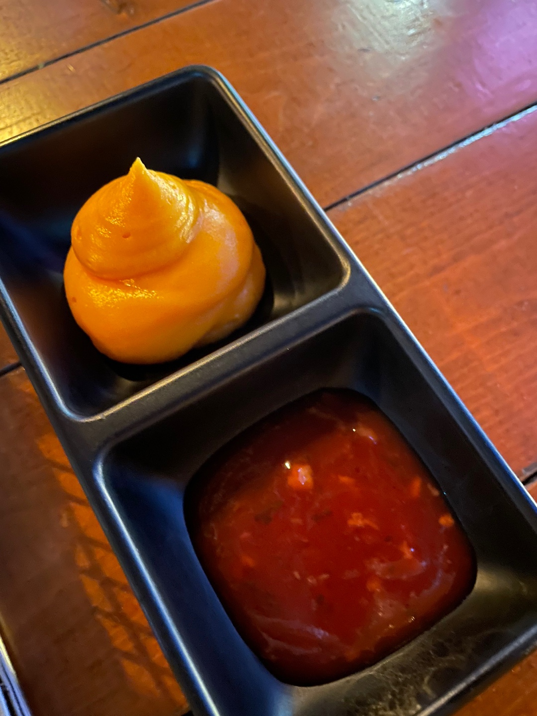 치즈가루가 뿌려진 나초를 치즈소스 또는 칠리소스 찍어먹으면