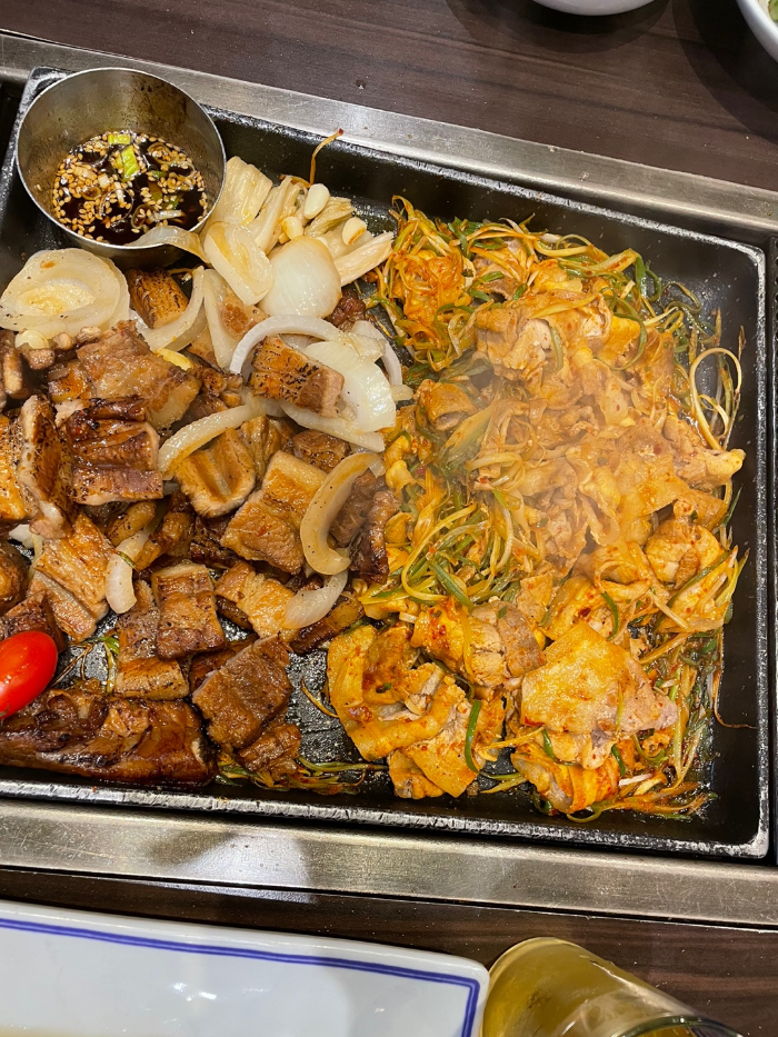 고기판에 돼지갈비와 철판삼겹살의 조화