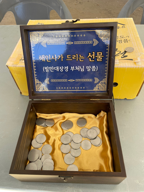 옆에 준비된 코인을 팔만윤장대에 넣고 돌리면