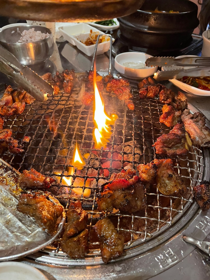 숯불위에 기름이 뚝뚝 떨어지면 불길이 확! 살아오르는데여